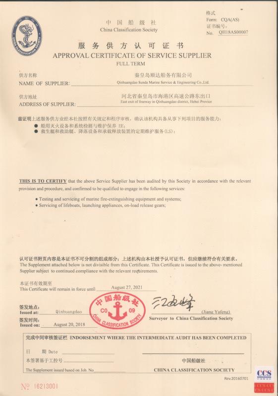 秦皇島順達(dá)船務(wù)有限公司位于美麗的海濱城市、中國(guó)北方著名的能源輸出大港--秦皇島。公司從事于船舶修理、物料供應(yīng)、水下檢測(cè)、船體測(cè)厚、消防救生設(shè)備及救生艇檢驗(yàn)、電氣自動(dòng)化修理等服務(wù)。 公司自1997年成立至今,先后為國(guó)內(nèi)外船東修理、檢驗(yàn)各類船舶萬余艘,積累了豐富的施工經(jīng)驗(yàn)。公司現(xiàn)有場(chǎng)地100余畝,員工30余人,以及工程用車若干臺(tái)。我們公司一直本著嚴(yán)以律己、真誠待人、精益求精、信譽(yù)至上的經(jīng)營(yíng)理念,以優(yōu)質(zhì)的服務(wù)、專業(yè)的施工、合理的收費(fèi),得到了國(guó)內(nèi)外船東的廣泛認(rèn)可,贏得了良好的口碑和信譽(yù)。 公司已取得了中國(guó)船級(jí)社(CCS)、美國(guó)船級(jí)社(ABS)、日本船級(jí)社(NK)、德國(guó)船級(jí)社(DNV GL)等各個(gè)船級(jí)社的消防救生和救生艇檢驗(yàn)資質(zhì), ...